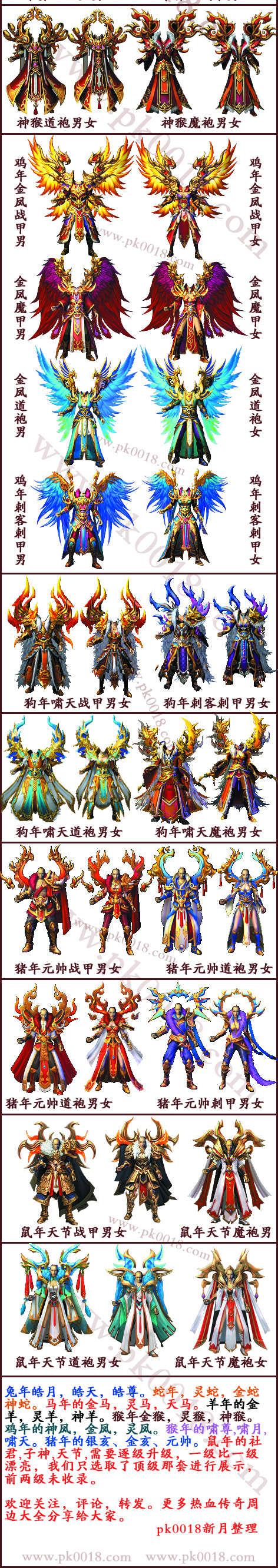 蛇年以后都是三套武器,如灵蛇,金蛇,神蛇这样,就如图所示,猪年道剑分三个,初级银亥,中级金亥,顶级元帅,逐级升级,一级比一级漂亮,我们只选取了最顶级那套给大家展示,前两级武器没做展示。手游传奇176小极品版本,无英雄,无内功,无特戒,无抽奖,无任务,装备全靠打,和公益服没区别。还有2008年开放至今的端游,pk0018新月传奇,金鼠套装,啸天套,天蓬套,金凤套,灵猴套,神羊套,金马套,灵蛇装套,军鼓,灵玉,马牌,首饰盒,鉴定,心法连击版本,无熔炼,无体格,无真气石等变态玩法。每年只更新一套装备,主打长久稳定,不变态。